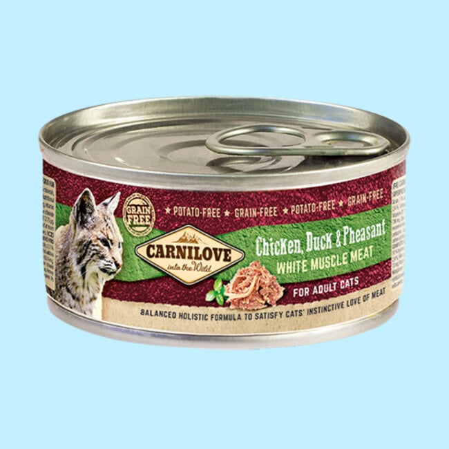 Carnilove into the wild blikvoer voor volwassen katten met kip, eend & fazant is volledig natuurlijk en groot vlees aandeel. De blikvoeding van Carnilove voor de kat voldoet aan voedingsbehoefte van volwassen katten. De bikvoeding is vrij van granen en aardappel en biedt zo een mooie evenwichtige voeding voor de kat. Door het gebruik van stukjes vlees verwerkt in paté is deze voeding extra aantrekkelijk voor de kat.